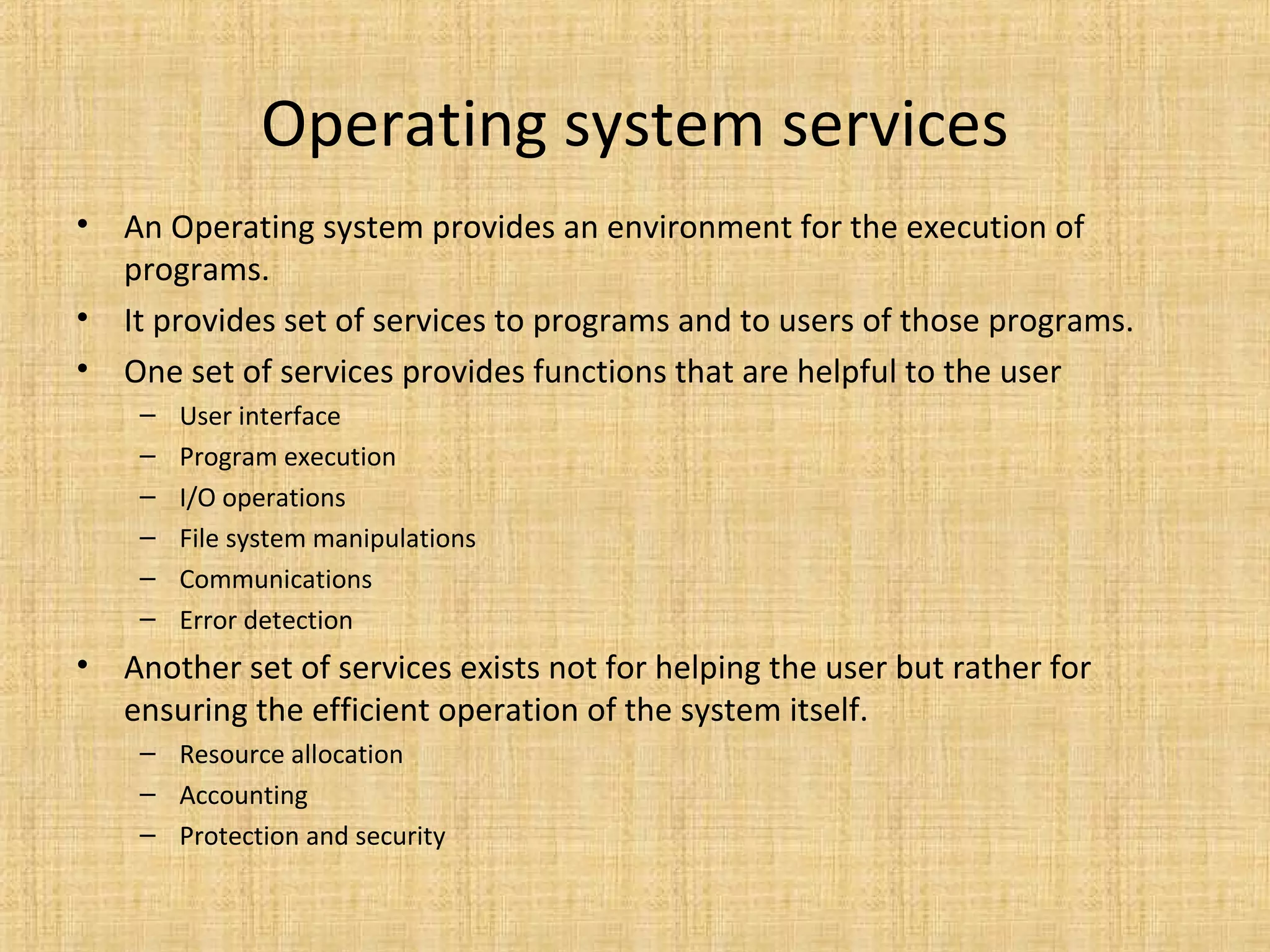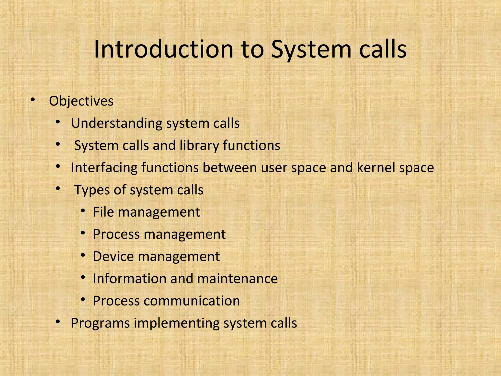 The document provides an overview of system calls and their role in operating systems, detailing various services provided by OS to users and system management. It explains the interface between user space and kernel space through system calls, library functions, and APIs, along with specific examples for file management operations. Additionally, it categorizes system calls into types related to process, file, device management, and discusses user interfaces like command line and graphical user interfaces.