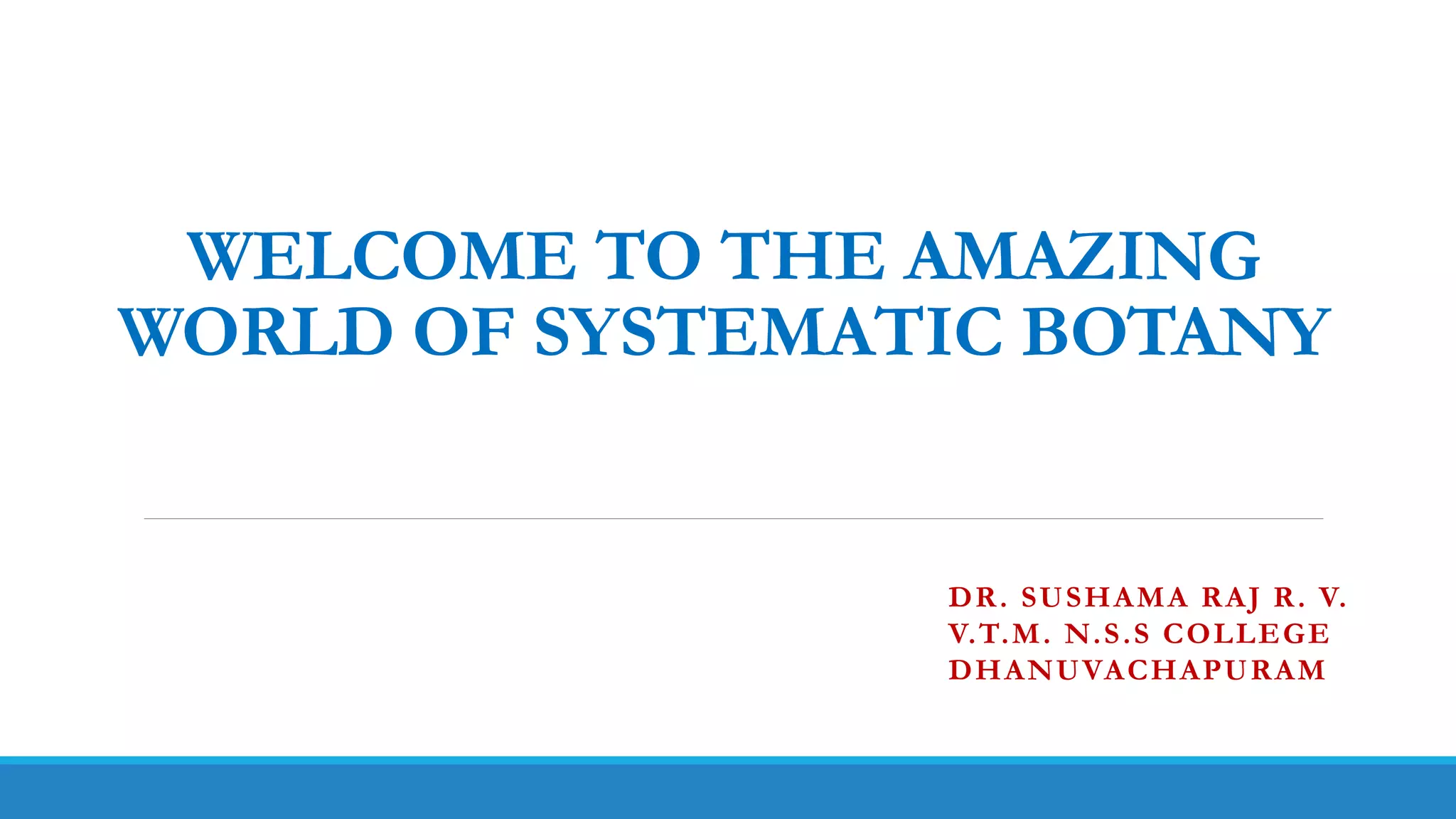 This document provides an overview of the history and importance of systematic botany. It discusses how systematic botany evolved from early classification attempts by ancient tribes and scholars like Aristotle and Theophrastus to the modern system developed by Carolus Linnaeus in the 18th century. Key developments include Linnaeus introducing the hierarchical classification system and binomial nomenclature, as well as contributions from Lamarck, Haeckel, Darwin, and others who advanced evolutionary understandings of classification. Systematic botany remains important for understanding biodiversity, evolution, and identifying important plant species.