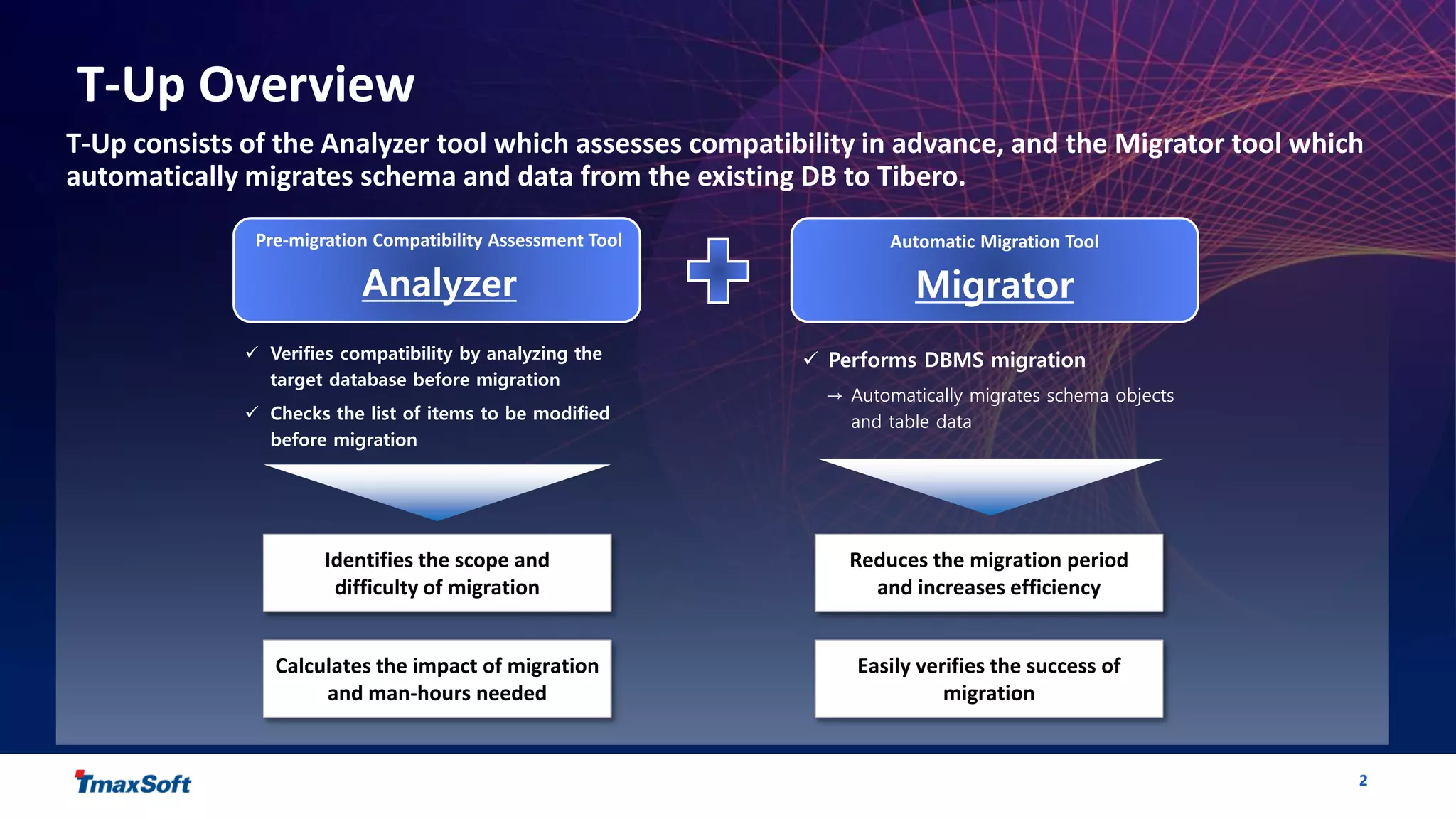 T-Up is a tool that consists of an Analyzer and Migrator to assess compatibility and automatically migrate databases from one DBMS to Tibero. The Analyzer assesses compatibility by analyzing database objects, SQL statements, and APIs to identify any issues and calculate migration efforts. It generates reports on support ratios and detailed information on unsupported items. The Migrator then extracts data definition language and data from the source database and loads it into Tibero, migrating objects and data with minimal manual work needed.
