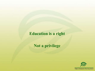 The Citizens Foundation (TCF) was formed in 1995 to provide education to underprivileged children in Pakistan. It has since expanded to over 600 school units nationwide educating 80,000 students, 50% of whom are girls. TCF aims to remove barriers to education by keeping school fees low and providing scholarships. It trains and supports dedicated teachers to deliver quality education programs. Many TCF students have gone on to higher education and successful careers, achieving dreams once thought impossible.