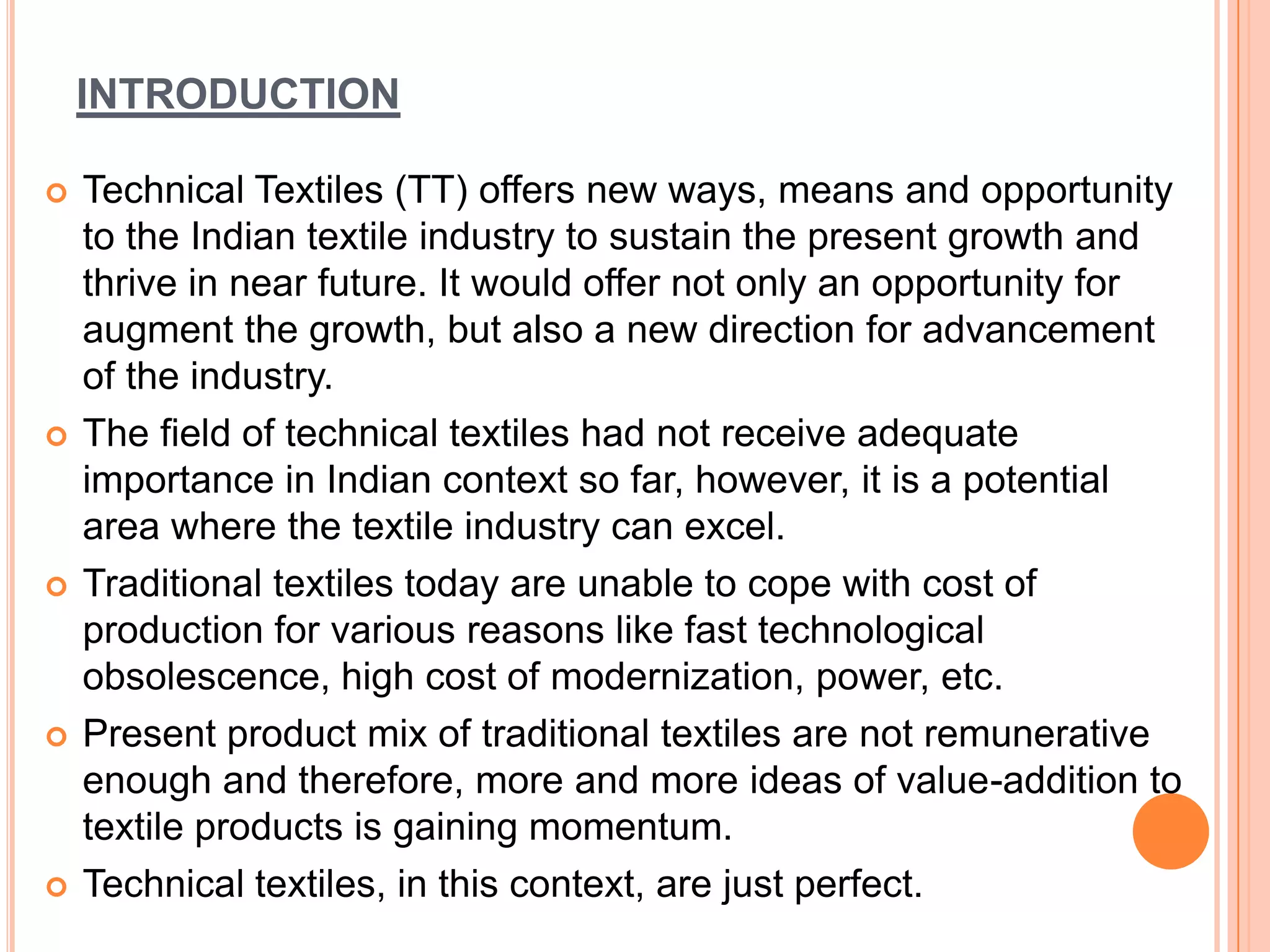 Technical textiles offer new opportunities for growth for the Indian textile industry. They provide functions beyond aesthetics and include materials for construction, agriculture, medical uses, and more. Currently technical textiles make up only 3% of India's textile market but are growing at 12% annually. The government aims to capture 10-12% of the global $6-8 billion technical textiles market in the next 10 years through targeting application areas that use indigenous materials and focus on value-added products. This will help diversify the textile industry and make it less reliant on traditional textiles.