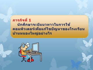 อหาการสอนโดยตรงไปยังผู้เรียน โดยบทเรียนคอมพิวเตอร์มีการทดสอบ การนาเสนอเนื้ อหา การ ทดสอบหลังเรียน บทบาทผู้เรียนก็เป็ นเพียงการท่องจาเนื้ อหา ไม่ ส่งเสริมกระบวนการคิด จากปัญหา คือ ครูพัฒนาสื่อคอมพิวเตอร์ในลักษณะที่เป็น เครื่องมือในการถ่ายทอดและนาเสนอเนื้อหาการเรียนการสอน โดยตรงไปยังผู้เรียน โดยในบทเรียนคอมพิวเตอร์มีการ ทดสอบ นาเสนอเนื้อหา การทดสอบหลังเรียน บทบาท ผู้เรียนก็ยังเป็นเพียงแค่การท่องจาเนื้อหา ซึ่งไม่ส่งเสริม กระบวนการคิด ซึ่งวิธีนี้ครูพัฒนาสื่อโดยการใช ้คอมพิวเตอร์ เป็นครู โดยวิธีนี้เป็นเพียงแค่การท่องจาเนื้อหา ซึ่งไม่ส่งเสริม กระบวนการคิดของผู้เรียน แก ้ปัญหาได ้จากการที่ครูใช ้ คอมพิวเตอร์เป็นครูเพียงอย่างเดียว ให ้เพิ่มการใช ้คอมพิวเตอร์ เป็นผู้ช่วย และ การใช ้คอมพิวเตอร์เป็นผู้เรียน แนวทางการใช ้คอมพิวเตอร์เพื่อแก ้ปัญหา