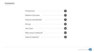 Textlocal is India's leading business SMS platform, offering easy-to-use features for sending promotional and transactional SMS to over 165,000 businesses. It provides services such as bulk SMS, API integration, and mobile marketing tools, all backed by best-in-class delivery and customer support. The platform is designed for SMEs and large enterprises, enabling effective communication through personalized messaging, real-time metrics, and customizable campaign management.