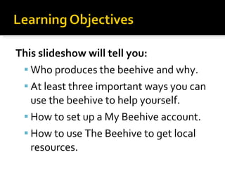 The document provides instructions for how to use The Beehive website. It summarizes that The Beehive is created by One Economy Corporation to provide resources to underserved communities. It explains how to create a My Beehive account, navigate the site's features, and access local resources on topics like health, education, employment and more. The Beehive has helped over 350,000 people learn about Medicaid and other important topics.