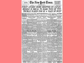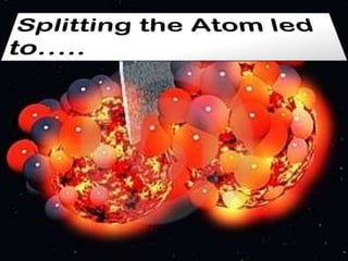 The document discusses the history of discoveries related to nuclear fission and the splitting of atoms. It describes key scientists in the 1930s like Enrico Fermi, Otto Hahn, Lise Meitner, and Fritz Strassmann who made discoveries about fissioning atoms that laid the groundwork for nuclear weapons. It also provides biographies of some of these scientists like Fermi, Hahn, Meitner, and their contributions to the understanding of radioactivity and nuclear physics.