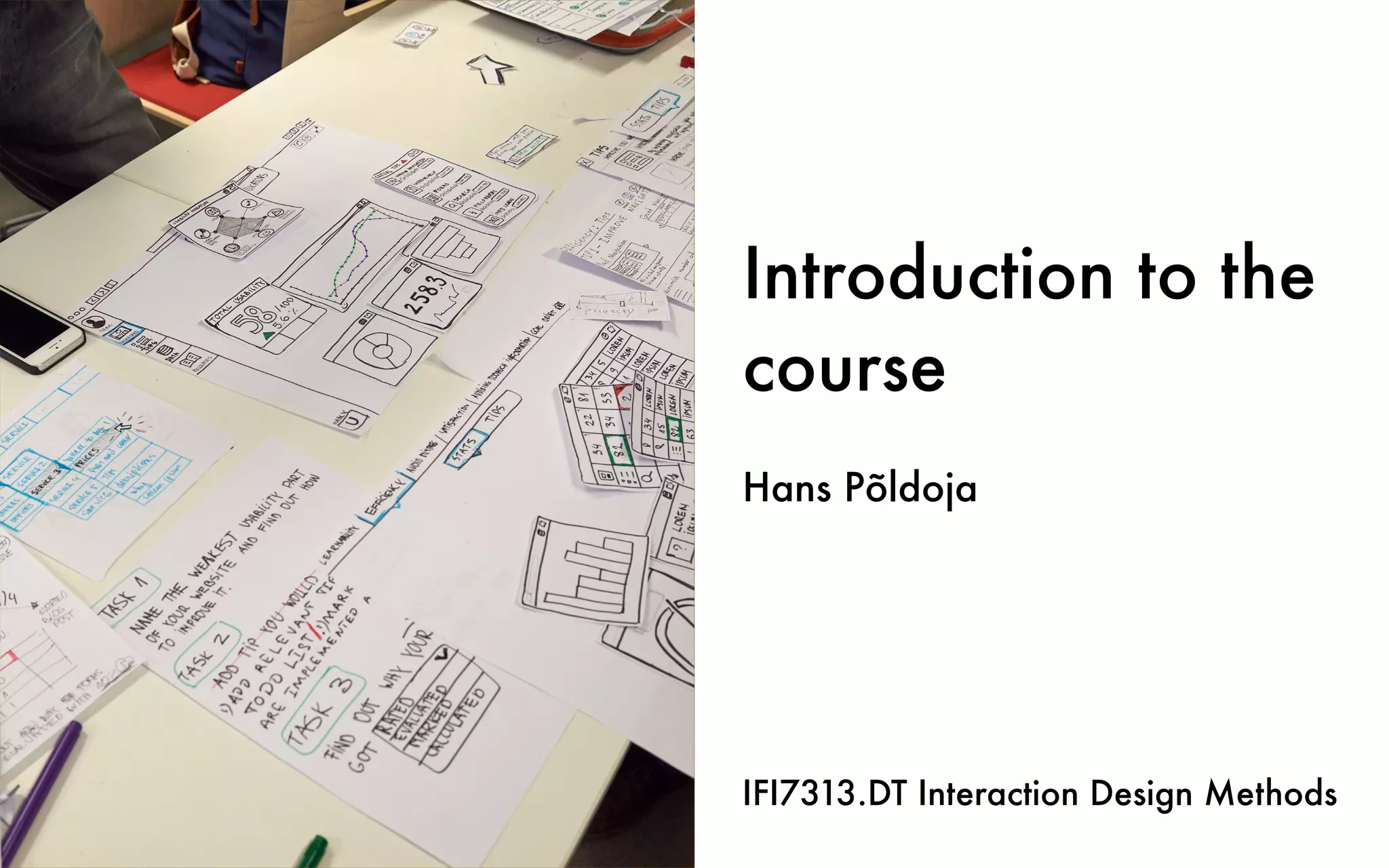 This document provides an introduction and overview of the IFI7313.DT Interaction Design Methods course. It introduces the course instructors Hans Põldoja and Vanessa Vorteil. The course objectives are to provide practical interaction design skills and theoretical background through academic literature. The course is part of an integrated HCI project involving multiple courses. It will cover interaction design methods through contact sessions, group projects, and readings. The schedule outlines the topics and assignments for each session throughout the semester. Grading will involve assignments, group work, and a final exam. Example projects from previous years are shown.