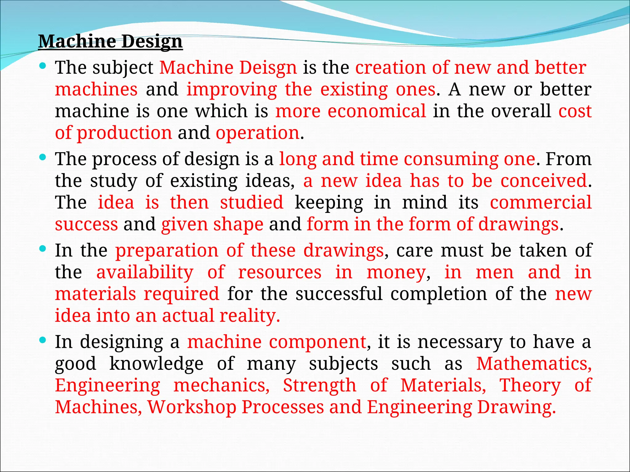 The document discusses machine design, highlighting the process of designing new machines, improving existing ones, and various types of machine design such as adaptive, development, and new designs. It covers essential aspects like the recognition of needs, analysis of forces, material selection, and factors influencing machine design, including safety and cost. Additionally, it outlines design rules, engineering materials, mechanical properties, and provides insight into stresses, strains, and specific design considerations.