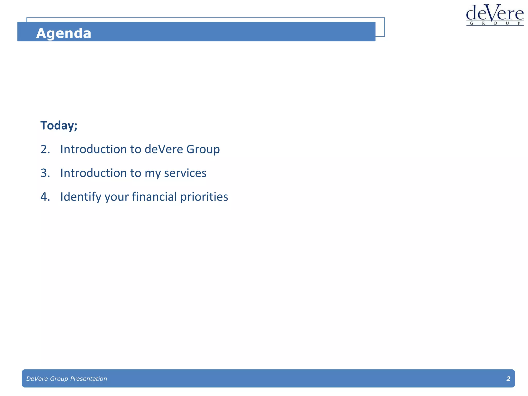 The presentation introduces DeVere Group, an independent financial services firm established in 1995 with 850 employees and $7 billion under management. It services 50,000 clients worldwide through 52 offices globally. The presentation highlights DeVere's services, including providing medium to low risk investment opportunities with annual returns of 9-12% and investor protection of up to 90%. It also discusses retirement, education, and capital growth planning services and how the presenter works with clients to understand their financial priorities and identify perfect solutions tailored to their needs and requirements.
