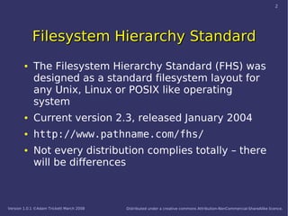 The Filesystem Hierarchy Standard (FHS) is a standard for organizing the files and directories on Unix, Linux, and POSIX-compliant operating systems. It defines the basic directory structure and standard locations for common files and programs. The current version is 2.3, released in 2004, which aims to provide consistency across systems and applications.