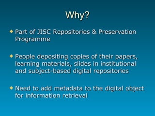 The document discusses the Names Project which aims to create a name authority service to help disambiguate author names when depositing materials in institutional repositories. It notes that people depositing content need to add accurate metadata about creators and affiliations but these are entered inconsistently. The project will develop a prototype database of name records over 17 months to test solutions and work with repositories to integrate name disambiguation. It will seek input from an expert panel and aims to make it easier for creators to assign unambiguous identities when submitting materials.