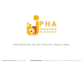 The document provides an introduction to the Passive House concept, emphasizing its benefits such as significant energy savings, improved health and comfort for occupants, and environmental resilience. It outlines key design principles, including insulation, airtightness, and ventilation, while highlighting the importance of certified professionals and components in achieving Passive House standards. Additionally, it discusses various types of buildings that can be designed as Passive Houses and cites the growing trend and policy support for such standards in the United States.