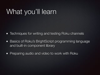This document provides an introduction and overview of the Roku SDK. It discusses the basics of developing Roku channels using the BrightScript programming language and built-in component library. It covers setting up the development environment, the file structure of Roku channels, common screens and objects, debugging, and preparing and loading content like audio and video. The document concludes with next steps like following Roku's design guidelines and publishing channels privately or to the public Roku channel store.