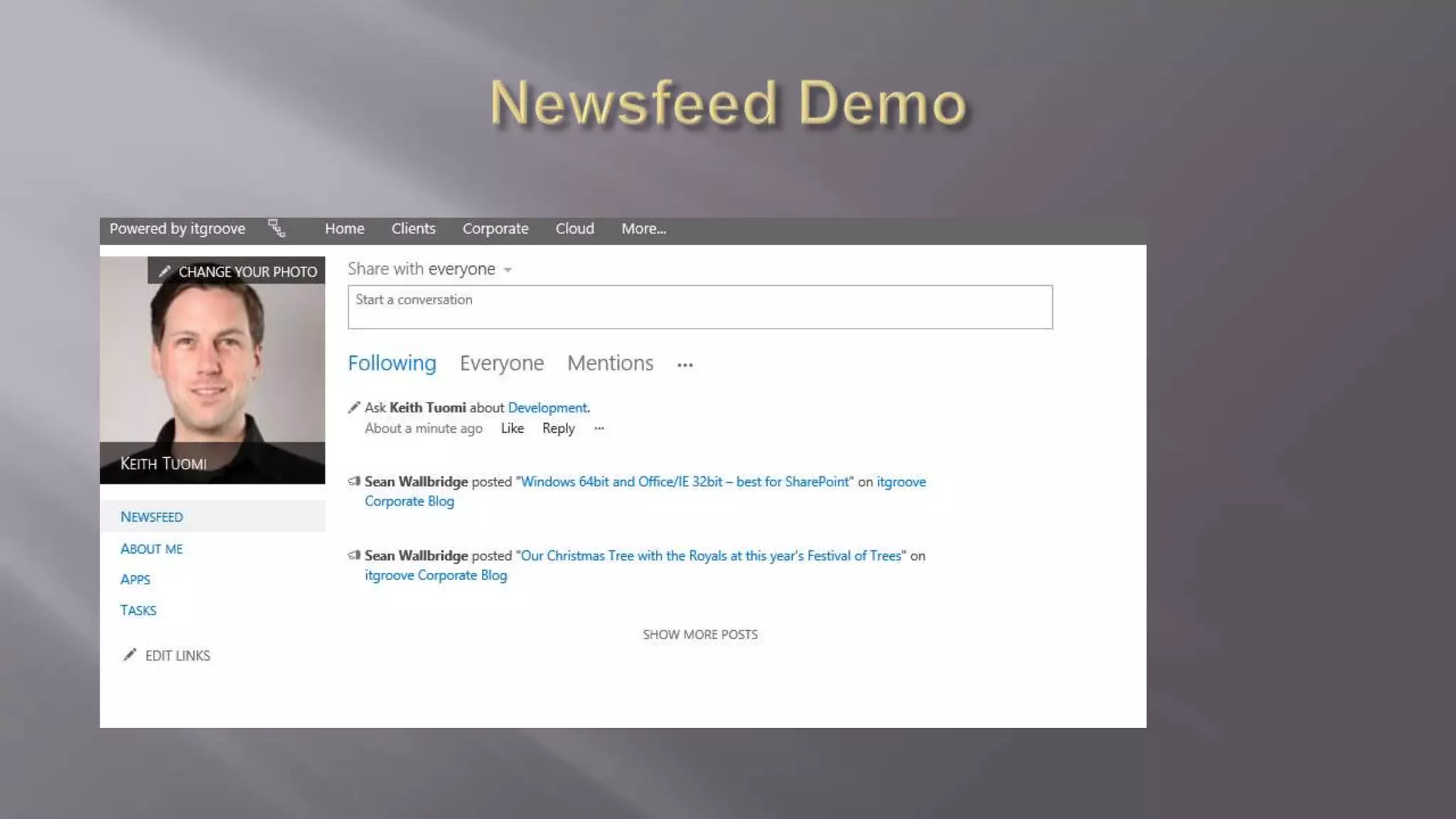 - The document discusses connecting user profiles to the SharePoint portal through the user profile service application, which contains user profiles, profile synchronization, audiences, my sites, social tags, and the newsfeed.