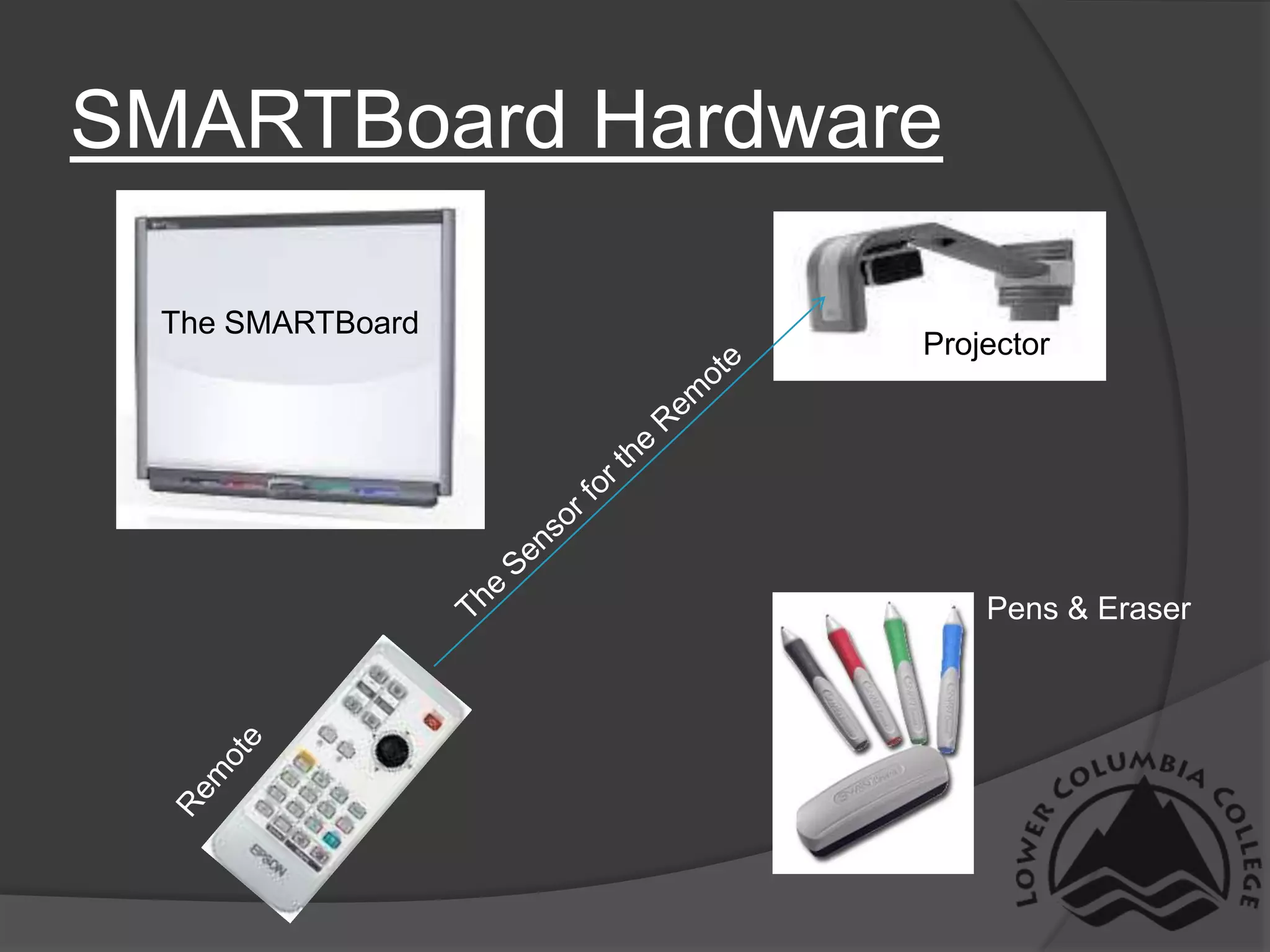 1) The document introduces the hardware components of a SMARTBoard, including the projector, sensor for the remote, pens, eraser and remote.