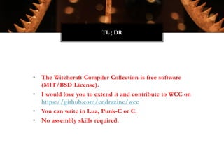 The Witchcraft Compiler Collection (WCC) is a free software suite designed for binary analysis and manipulation, allowing users to convert executables into shared libraries without requiring source code. It supports various programming languages and aims to enable advanced tasks such as dynamic analysis, fuzzing, and introspection of binaries through a scripting engine. The document outlines the motivations, components, capabilities, and future work for the WCC, emphasizing its potential applications in security research and reverse engineering.