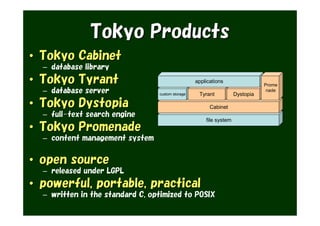 The document provides an overview of various Tokyo products, including Tokyo Cabinet, Tokyo Tyrant, Tokyo Dystopia, and Tokyo Promenade, detailing their functions as database libraries, database servers, full-text search engines, and content management systems. It emphasizes features such as high performance, scalability, and compatibility with different programming languages, while also discussing the architecture and operational capabilities of these systems. Additionally, example code is presented to illustrate the use of the various libraries in practical applications.