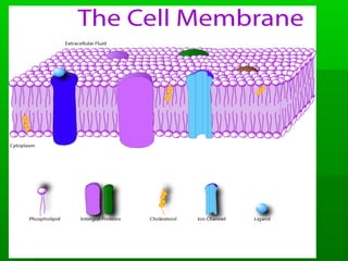 Cell membranes allow molecules to pass in and out of cells through passive or active transport in order to maintain homeostasis. Passive transport involves molecules moving down their concentration gradient through the cell membrane without requiring energy. Active transport moves molecules against their concentration gradient by using energy. This allows cells to regulate the movement of substances and control what passes through the selectively permeable cell membrane.