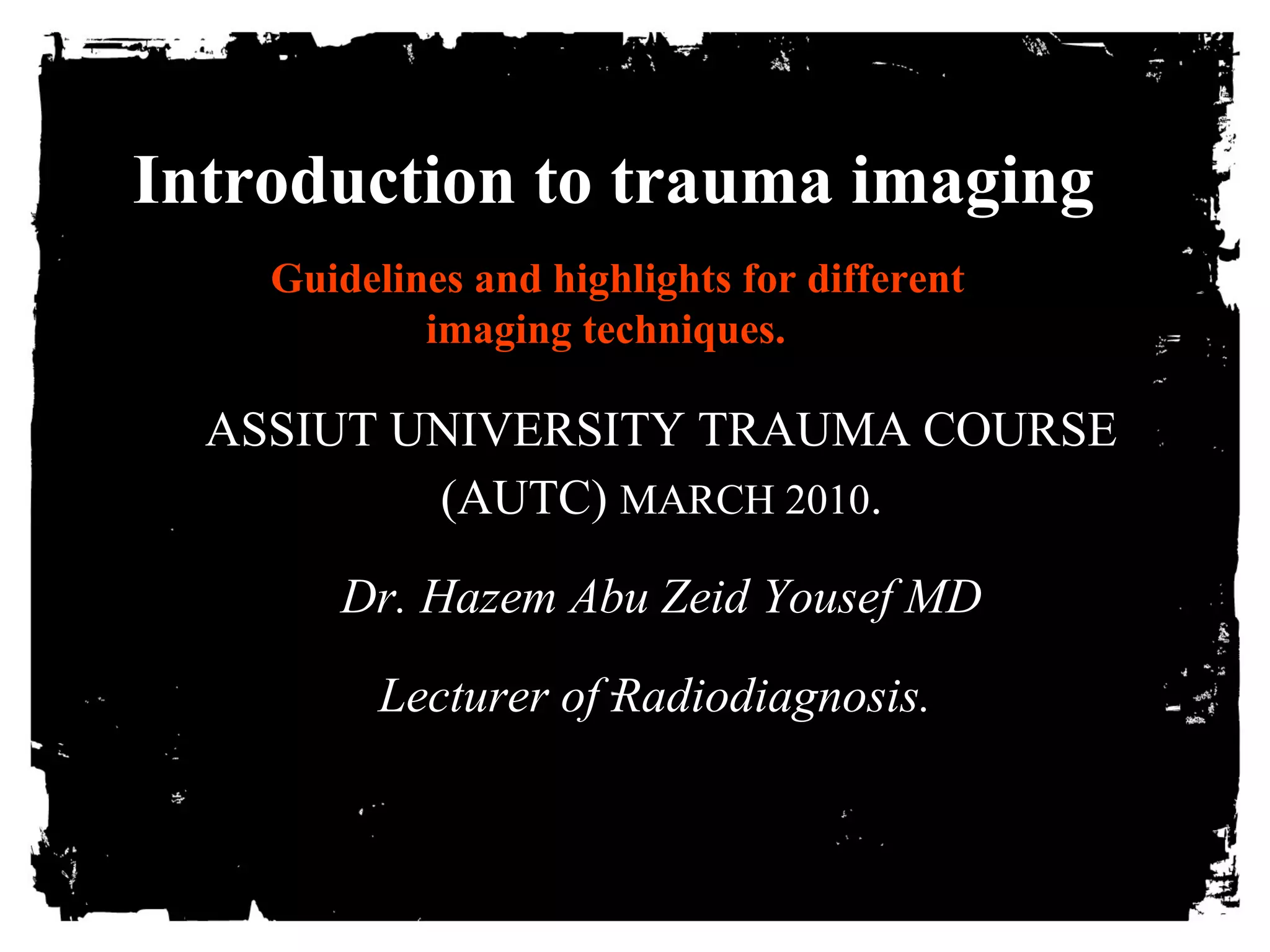 The document outlines trauma imaging guidelines and techniques presented at the Assiut University Trauma Course in March 2010, emphasizing the critical role of timely imaging in trauma care. It discusses specific modalities such as skull radiography and CT scans for diagnosing head and chest injuries, while advocating against routine skull X-rays in pediatric cases. Additionally, it covers the diagnostic approach to spinal injuries and the importance of utilizing various imaging modalities based on clinical indications.