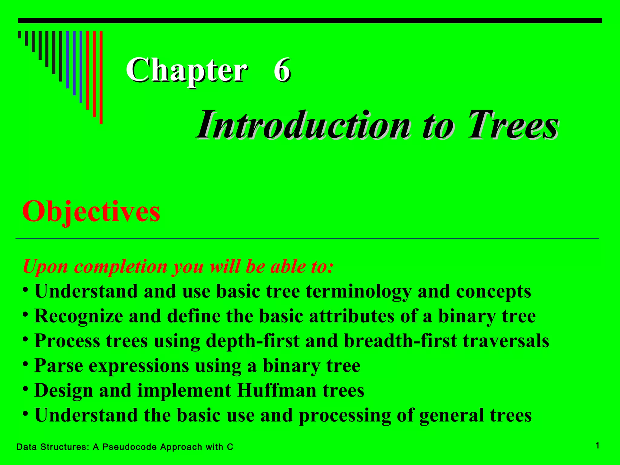 The document introduces the chapter on trees which covers basic tree terminology and concepts, binary trees, and general trees. It discusses understanding and using tree terminology, recognizing binary tree attributes, performing depth-first and breadth-first traversals on trees, parsing expressions using binary trees, designing and implementing Huffman trees, and understanding the basic use and processing of general trees. The chapter also covers properties of and traversals on binary trees, using trees for expression parsing and Huffman coding, insertions and deletions in general trees, and converting a general tree to a binary tree.