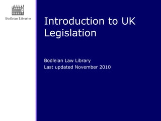This document provides an overview of UK legislation, outlining the different types of primary and secondary legislation, the legislative process, and sources for finding legislation. It describes how bills become acts and the process bills go through in Parliament, and explains how to cite acts and statutory instruments. Sources discussed include legislation websites, current awareness services, annotated statutes, and updated legislation consolidations.