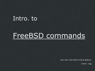 This document provides an introduction and outline for a presentation on FreeBSD commands. It discusses how FreeBSD is Unix-like and provides an overview of commands related to users, networking, file ownership and access permissions. As an example, it demonstrates how to use the cp command to copy a file, listing the original file, running the cp command, and then listing both the original and copied file.