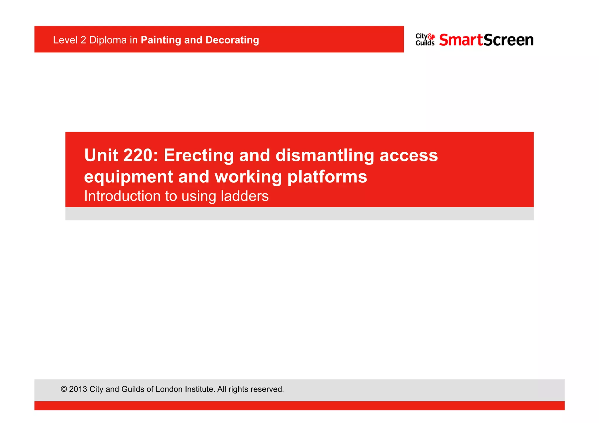The document discusses safe ladder use and access equipment. It covers topics like pre-use checks, setting up ladders at the proper angle, securing ladders when in use, avoiding overhead hazards, and ensuring three points of contact are maintained. Guidelines are provided around using ladders for under 30 minutes and for light work only.