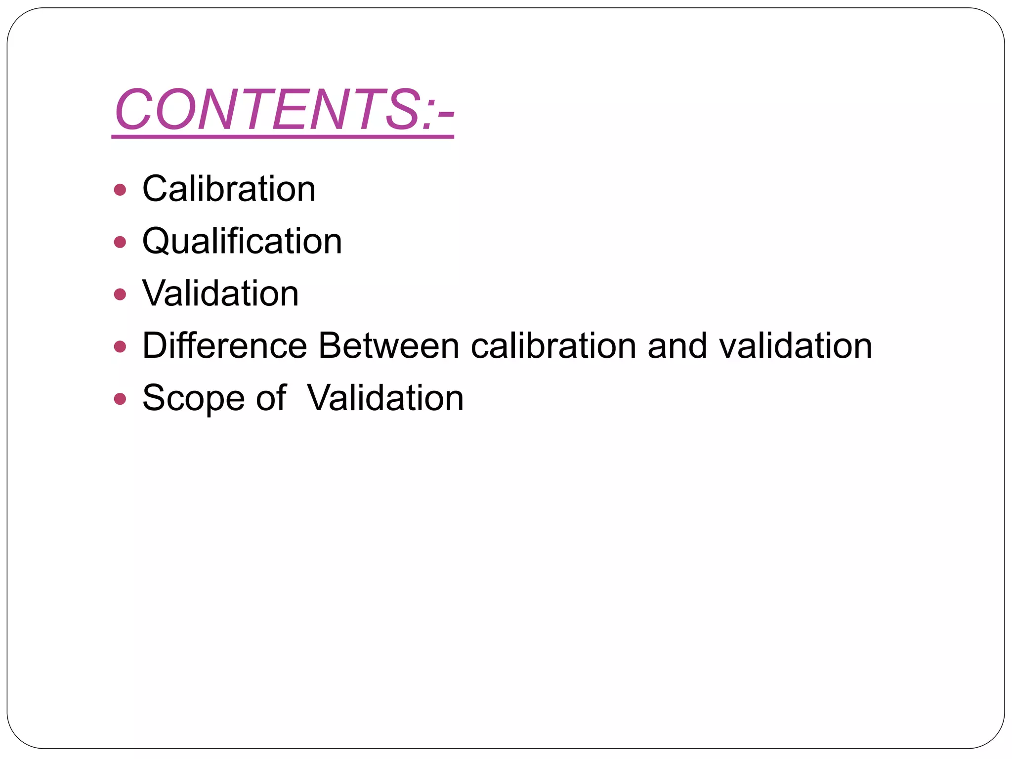 This document provides an introduction to validation, including calibration, qualification, and the difference between calibration and validation. It discusses the scope and purpose of calibration to ensure consistent and accurate measurements. Qualification refers to demonstrating equipment is suitable for its intended use and performs properly, including design, installation, operational, and performance qualification phases. Validation involves systematically determining if facilities, systems, and processes perform as intended. The key difference between calibration and validation is that calibration compares measurements to a reference standard, while validation does not use reference standards. The scope of validation requires appropriate organization, documentation, personnel, and finances.