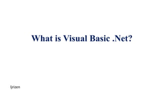 Visual Basic .NET (VB.NET) is a programming language and framework used to create applications for Windows and web. It is a successor to Visual Basic that uses the .NET framework. VB.NET allows programmers to create both graphical user interface elements and event procedures that respond to user actions. Developing a VB.NET application involves designing the interface, listing needed controls and events, writing pseudocode, implementing the code, testing for errors, and debugging. Integrated development environments like Visual Studio and relational databases are typically used along with VB.NET.