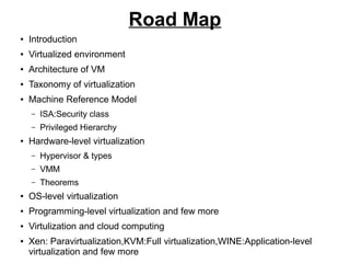 The document discusses various aspects of virtualization, including types, architectures, advantages, and techniques. It covers hardware-level, operating system-level, and application-level virtualization, detailing the roles of hypervisors and virtual machine managers. Additionally, it addresses the significance of virtualization in cloud computing and its pros and cons, such as performance degradation and security vulnerabilities.