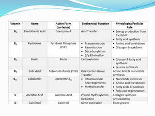 The document discusses vitamins, their history, importance, classification, dietary allowances, food sources, and deficiency symptoms. It highlights the role of vitamins in biochemical functions for growth and health, and categorizes them into water-soluble and fat-soluble groups. Specific vitamins like thiamin, riboflavin, niacin, and others are explored in detail concerning their health benefits and dietary needs.