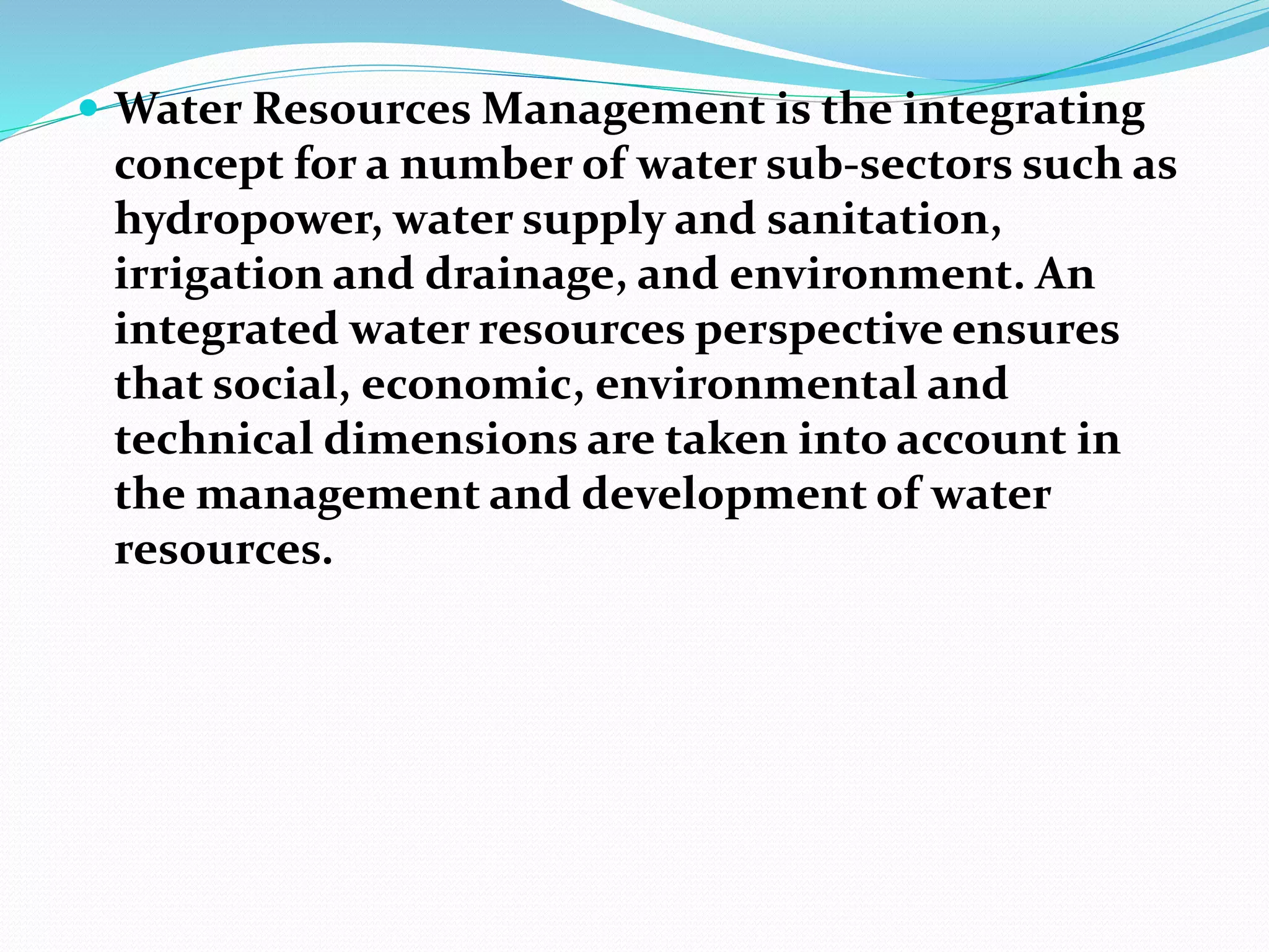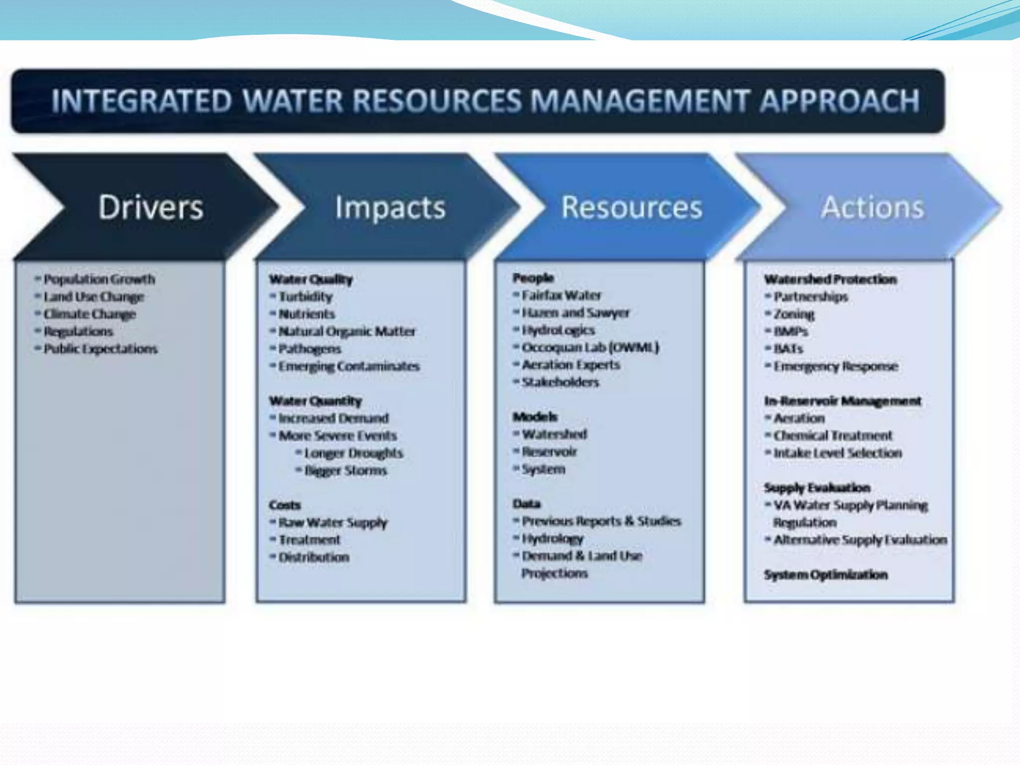 Integrated water resources management considers multiple perspectives in water management decisions. It aims to balance social, economic, environmental and technical factors. Key challenges include accommodating different viewpoints from governmental and interest groups, geographic regions, academic disciplines, and facilitating coordination between stakeholders. Total water management pursues the sustainable and equitable allocation of limited water resources through efficient, collaborative and adaptive long-term planning.