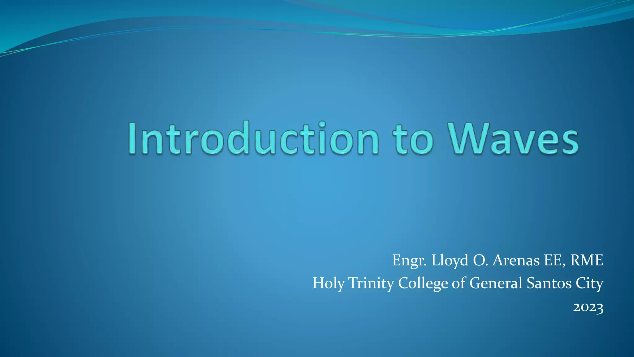 This document discusses waves and their characteristics. It begins by defining a wave as a disturbance that transfers energy through matter or space without transferring matter. It then discusses various wave characteristics including amplitude, wavelength, frequency, speed, period, and phase. Examples are provided to demonstrate calculating wave speed from frequency and wavelength. Different types of waves are introduced, such as transverse waves and longitudinal waves. The document concludes by discussing topics like wave interference, standing waves, and the definition of nodes and antinodes.