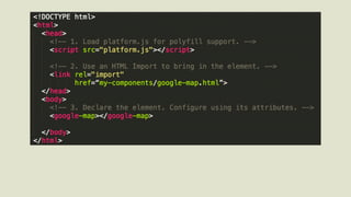 Web Components allow developers to build reusable custom elements that encapsulate HTML, CSS, and JavaScript. They include features like Shadow DOM for encapsulation, templates for stamping out repeated sections, HTML imports for modular code, and custom elements for defining new types of elements. Polymer makes it easy to build web applications using these new web component standards by providing polyfills and a set of pre-built reusable elements.