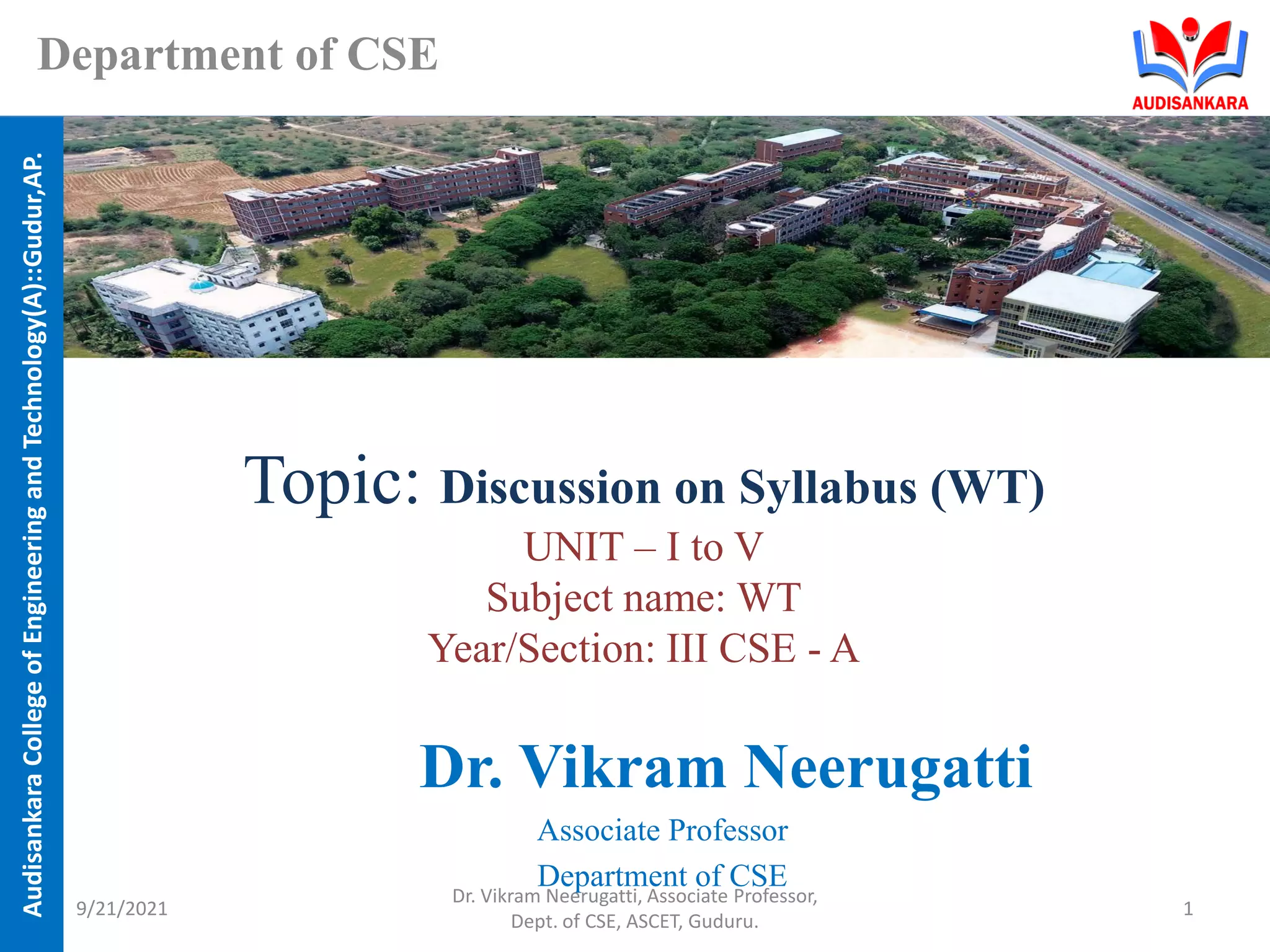 The document discusses the syllabus for the Computer Science Engineering department at Audisankara College of Engineering and Technology, focusing on various units, objectives, outcomes, and action plans for students. Dr. Vikram Neerugatti emphasizes practical learning and real-time application in projects, encouraging students to clarify doubts and plan effectively for their coursework. The content also includes references to Bloom's taxonomy and aims to prepare students for interviews with completed projects.