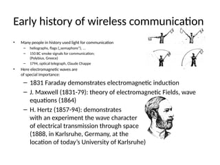 The document provides a comprehensive history of wireless communication, detailing significant milestones from early light-based communication methods to modern wireless technologies. Key developments include the invention of wireless telegraphy by Marconi in 1895, the introduction of GSM in the 1990s, and advancements toward 4G networks. It also discusses the increasing demand for mobile communication and the integration of wireless networks with fixed networks for improved service delivery.