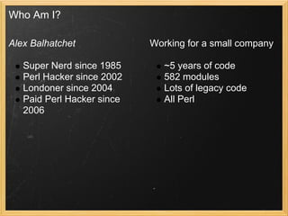 The document discusses best practices for writing readable and maintainable Perl code, emphasizing the importance of using strict and warnings pragmas, leveraging CPAN modules, and adhering to consistent coding styles. It highlights techniques like utilizing builtins, throwing exceptions for error handling, and maintaining clarity over cleverness in coding. Tools such as Perl::Critic and Perl::Tidy are recommended for improving code quality and readability.