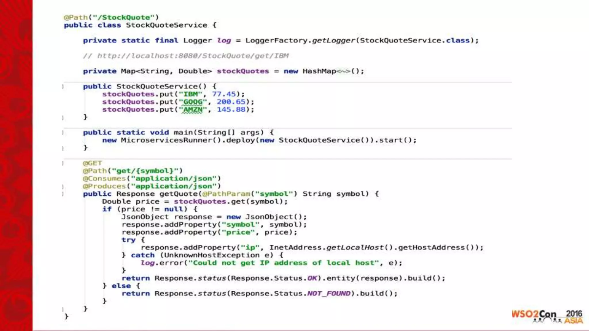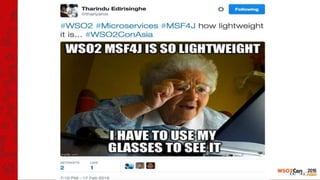 The document discusses WSO2 Microservices Framework for Java (MSF4J), which is a lightweight, high performance framework for building microservices in Java. MSF4J uses Java annotations to define microservices APIs and metrics. It provides a simple development model, is lightweight and fast, and has built-in support for metrics, analytics, and integration with WSO2 Data Analytics Server. The document reviews MSF4J's performance, memory usage, implementation details, features like security and tooling, and provides examples of MSF4J in use.