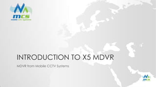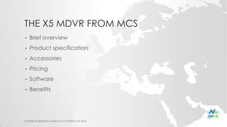 The X5 MDVR from Mobile CCTV Systems is a 4-channel video recorder with various features including anti-vibration technology, modular design, dual video streams, built-in GPS, 3G, and WiFi for remote monitoring. It has a patented file system for reliable data storage and recovery. Accessories include control panels, monitors, and mounting brackets. Software includes local and remote viewing applications. Benefits include low cost of ownership, 3-year warranty, high video quality, and flexibility.