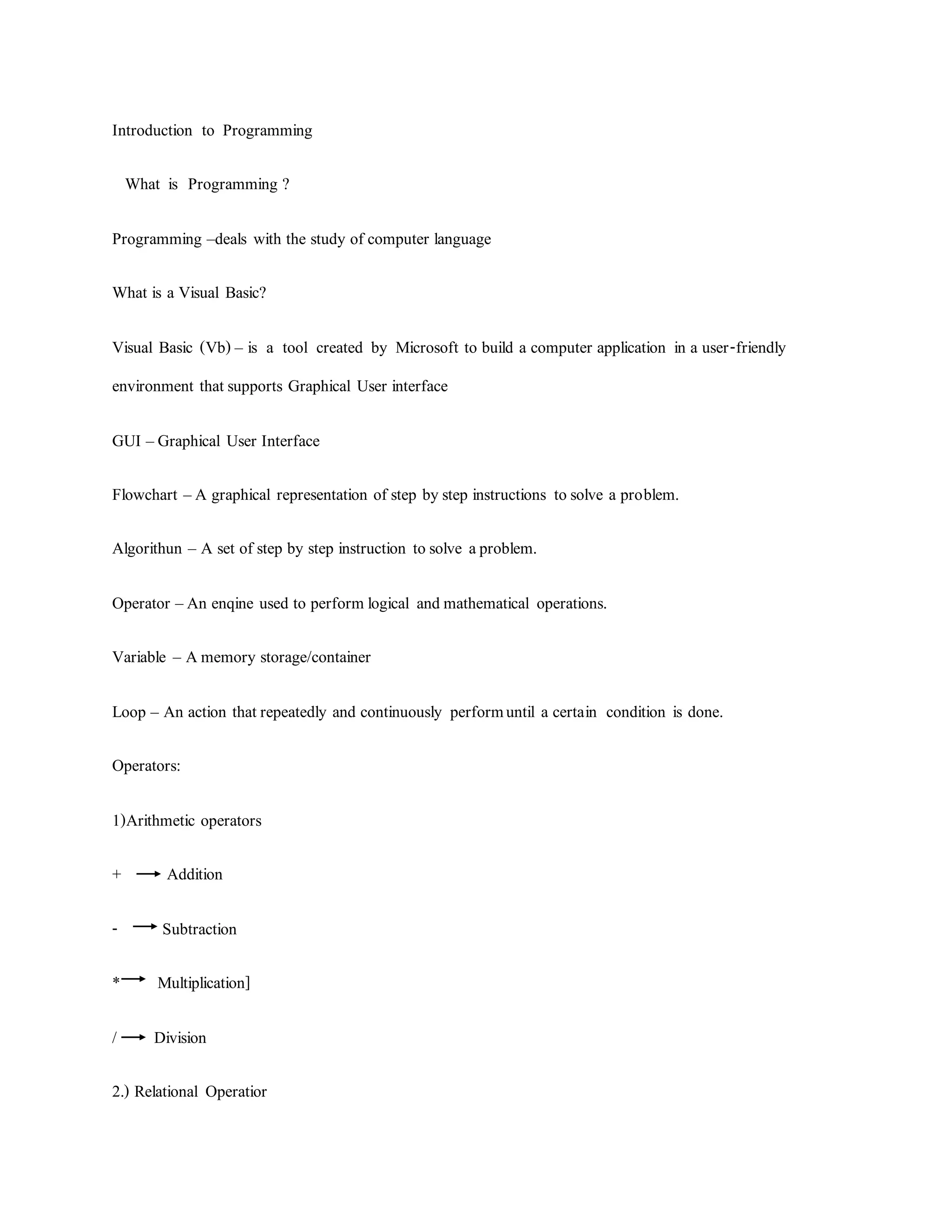 This document provides an introduction to programming concepts. It defines programming as dealing with computer languages and visual basic as a tool created by Microsoft to build graphical user interface applications. It discusses flowcharts as a graphical representation of step-by-step instructions to solve a problem and algorithms as a set of instructions to solve a problem. It also defines operators, variables, loops, and provides examples of arithmetic, relational, and logical operators. Finally, it shows examples of a flowchart and algorithm that use variables and conditions.