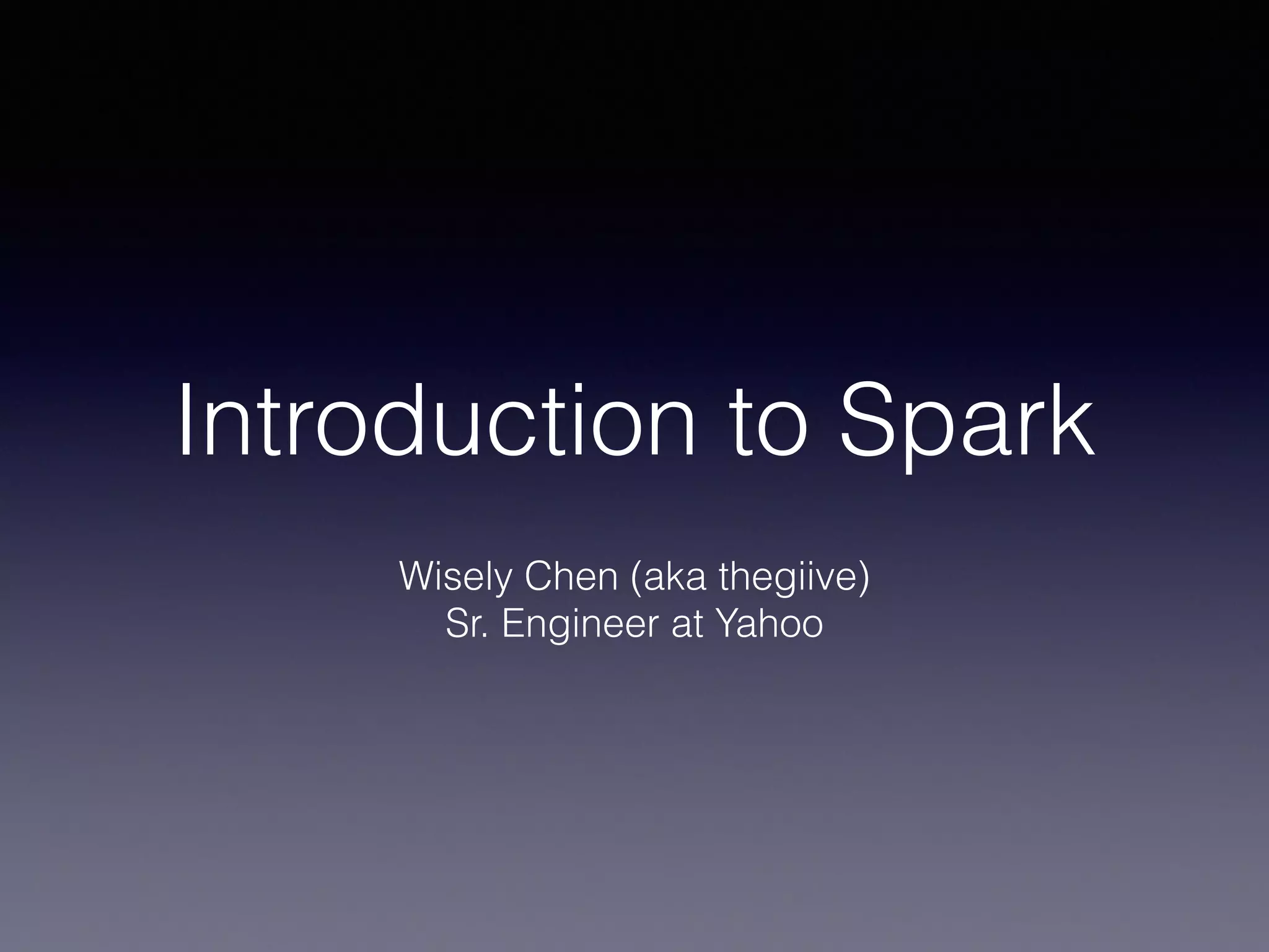 The document is a presentation by Wisely Chen, a Senior Engineer at Yahoo, introducing Apache Spark, a fast engine for large-scale data processing that is seen as the successor to MapReduce. It covers the Spark ecosystem, its advantages over Hadoop, and provides examples of using Spark with Python, Java, and Scala for data processing tasks. The presentation also highlights Spark's real-time analytics capabilities, machine learning applications, and the future of data processing frameworks.