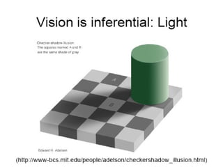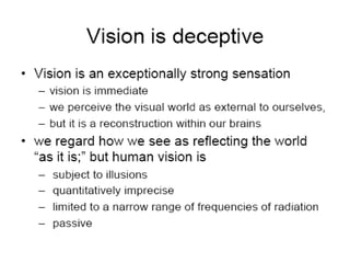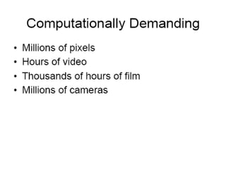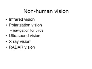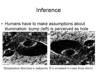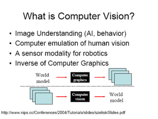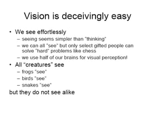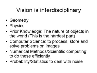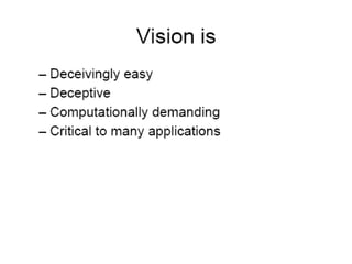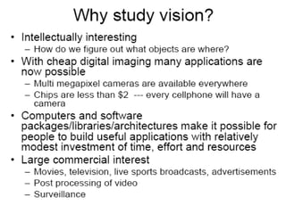 This document provides an introduction to the field of computer vision. It discusses (1) the goals of understanding and modeling visual processing in humans and building artificial vision systems, (2) how the human retina represents images and the brain processes them to recognize faces and objects, and (3) psychophysical experiments used to test hypotheses about visual processing, including inattentional blindness and change blindness. Figure-ground segregation is also introduced, where only one side of a contour is perceived as the figure based on cues like symmetry, convexity, and region.
