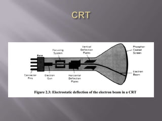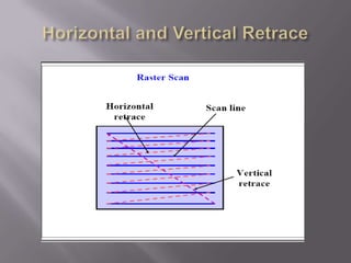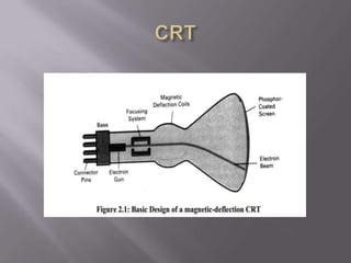 This document discusses computer graphics and its applications. It defines computer graphics as the field concerned with digitally synthesizing and manipulating visual content. The two main types are raster (composed of pixels) and vector (composed of paths). Raster images are bitmaps mapped to a grid, while vector images use mathematical formulas. Common graphics applications include paint programs, animation software, CAD, and desktop publishing. Cathode ray tubes are used to display images by scanning an electron beam across a screen coated with phosphors.