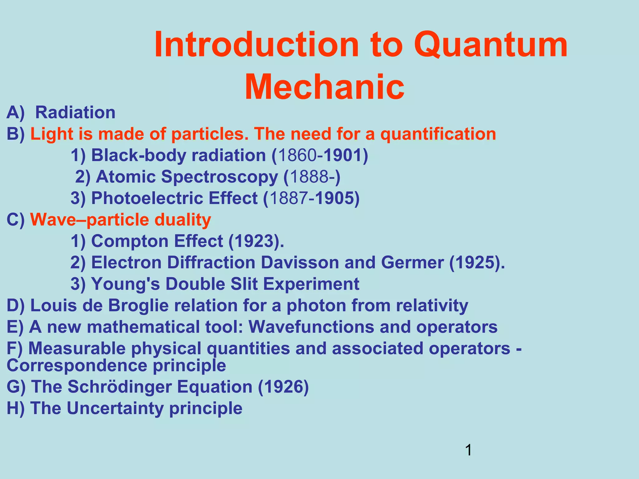 1) It discusses early discoveries that led to the development of quantum mechanics, including black-body radiation, atomic spectroscopy, the photoelectric effect, and wave-particle duality experiments like the Compton effect and electron diffraction.