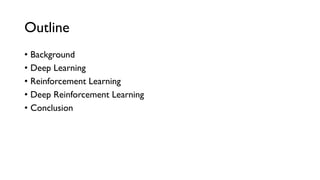This document provides an introduction to deep reinforcement learning. It begins with background sections on deep learning and reinforcement learning. Deep learning involves using neural networks to learn representations of data, while reinforcement learning describes how agents can learn behaviors through trial-and-error interactions with an environment. The document then explains how deep reinforcement learning combines the two by using deep neural networks to approximate value and policy functions for reinforcement learning agents. Examples of deep reinforcement learning successes in playing Atari games are provided.