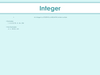• An integeris a POSITIVE or NEGATIVE whole number