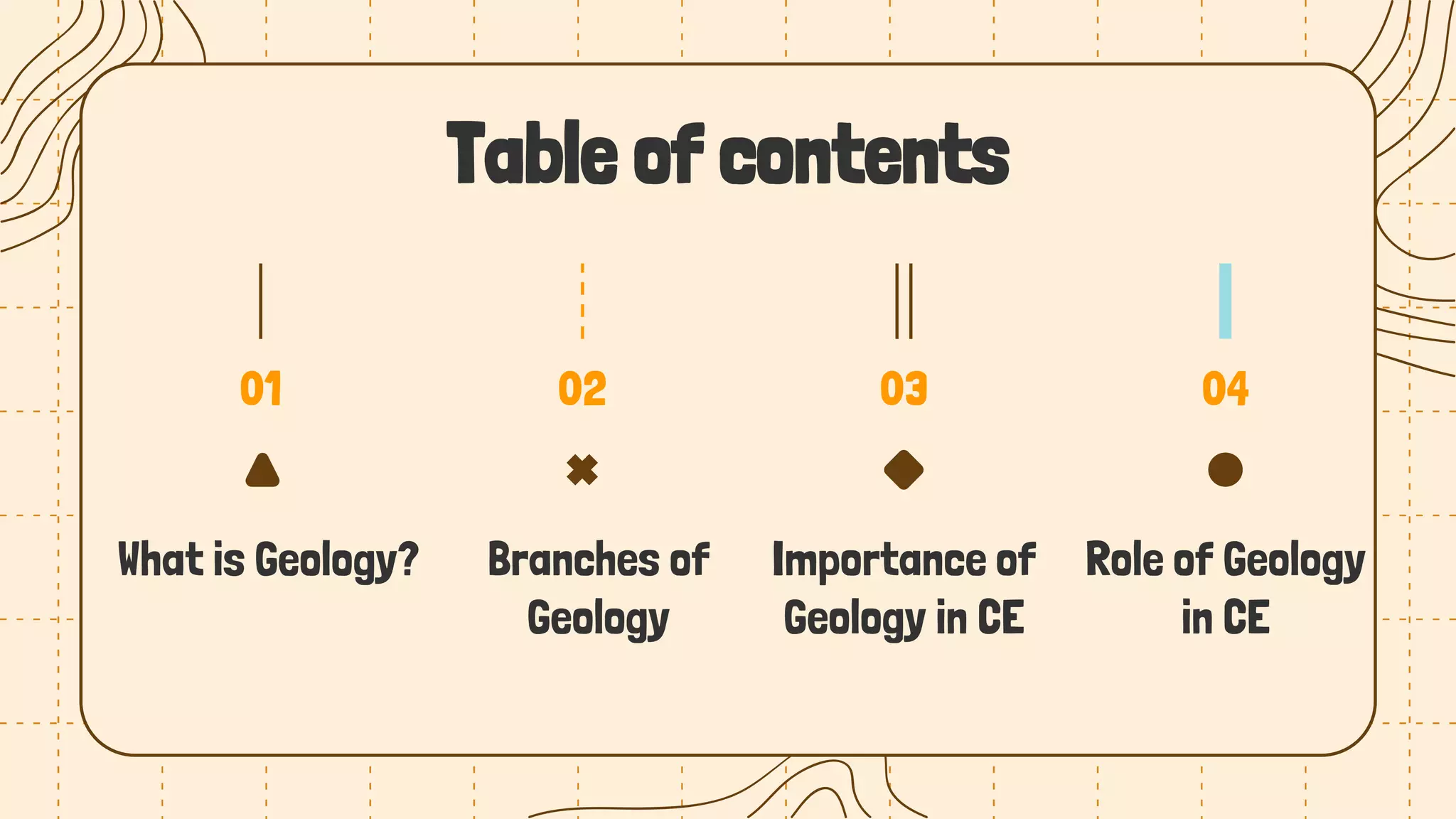 This document discusses the role of geology in civil engineering. It begins with defining geology and its various branches including geochemistry, geologist, geological survey, and geological maps. It then discusses the different branches of geology such as physical geology, crystallography, mineralogy, petrology, structural geology, and stratigraphy. The document emphasizes that civil engineering geology involves applying geological knowledge to ensure safety, efficacy, and cost-effectiveness of engineering projects. Finally, it outlines the key roles of geology for civil engineering projects, which include providing construction materials, assisting with soil conservation and river/coastal works, aiding tunneling and road works, informing dam, bridge and building designs, assessing groundwater, creating geological