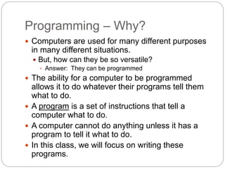 This document provides an introduction to computer programming. It discusses why computers can be programmed, and defines what a program is. It then explains the basic hardware components of a computer like the CPU, memory, and input/output devices. It also discusses software, the program development cycle of analyzing a problem, designing an algorithm, writing code, testing and debugging. It provides examples of flowcharts and pseudocode to design algorithms. The overall summary is an introductory overview of computer programming concepts.