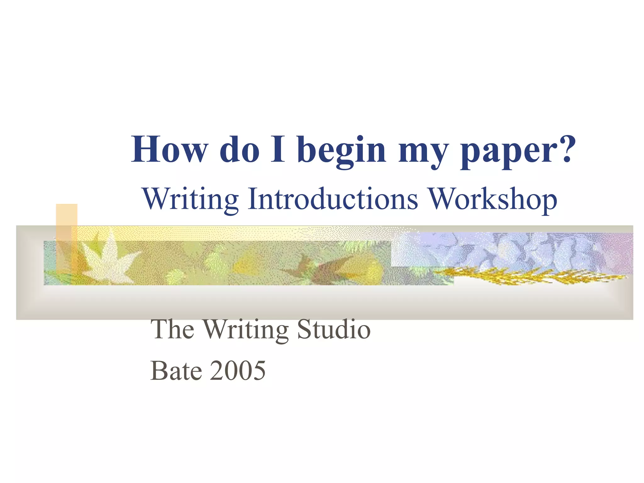 This document provides guidance on writing introductions for papers. It states that introductions are important for making a good first impression and engaging the reader. A strong introduction should get the reader's attention, identify the specific topic, conceptualize the main argument, and explain how the paper is organized. It recommends starting with an interesting quote, story, or fact; stating the purpose clearly without saying "this paper is about"; and including a thesis statement at the end of the introductory paragraph. The introduction length can vary depending on the complexity of the topic and length of the overall paper.