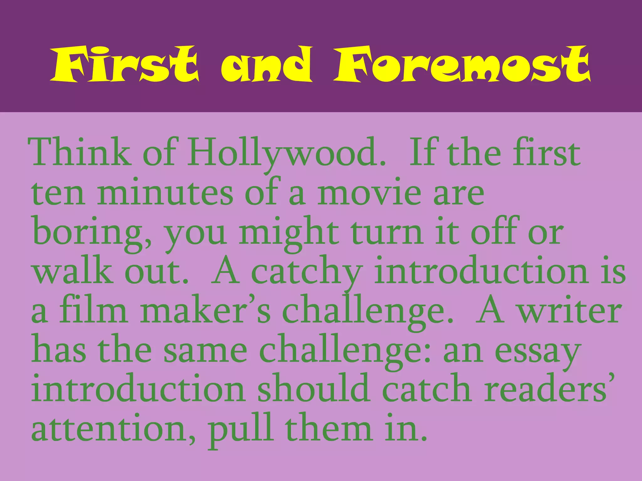 The document provides strategies for writing effective introductions and conclusions to essays. It begins by explaining that introductions should catch the reader's attention and introduce the thesis. Several introduction strategies are then presented with examples, including telling a story, asking questions, using a theme statement, or providing background information. The document concludes by stating that conclusions should stress the main point and leave a final impression, and provides strategies like echoing the introduction or tying together essay details.