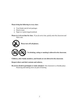 This document provides instructions for an English language class. Students are told to bring required materials like a binder to each class and to arrive on time. Cell phones should be turned off, and no food, drinks or smoking are allowed. Friends and family not enrolled in the class may not attend. Students are encouraged not to be afraid of participating or making mistakes as the classroom is meant to be friendly and supportive of learning. The document then provides vocabulary, conversations, grammar explanations and exercises for students to practice greetings, introductions, prepositions and verb conjugations.